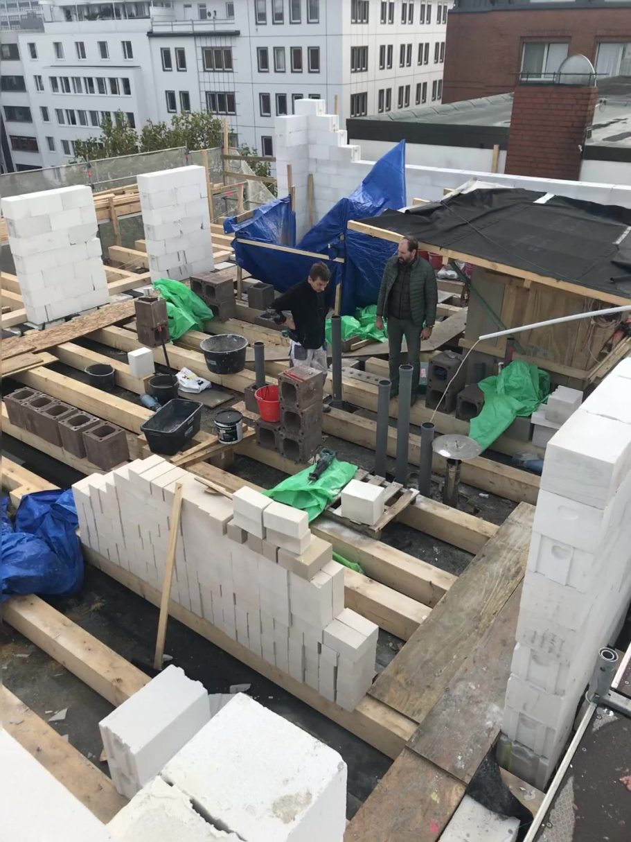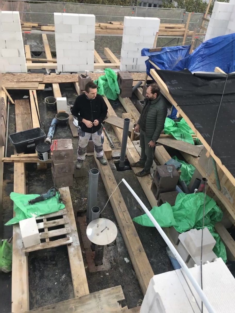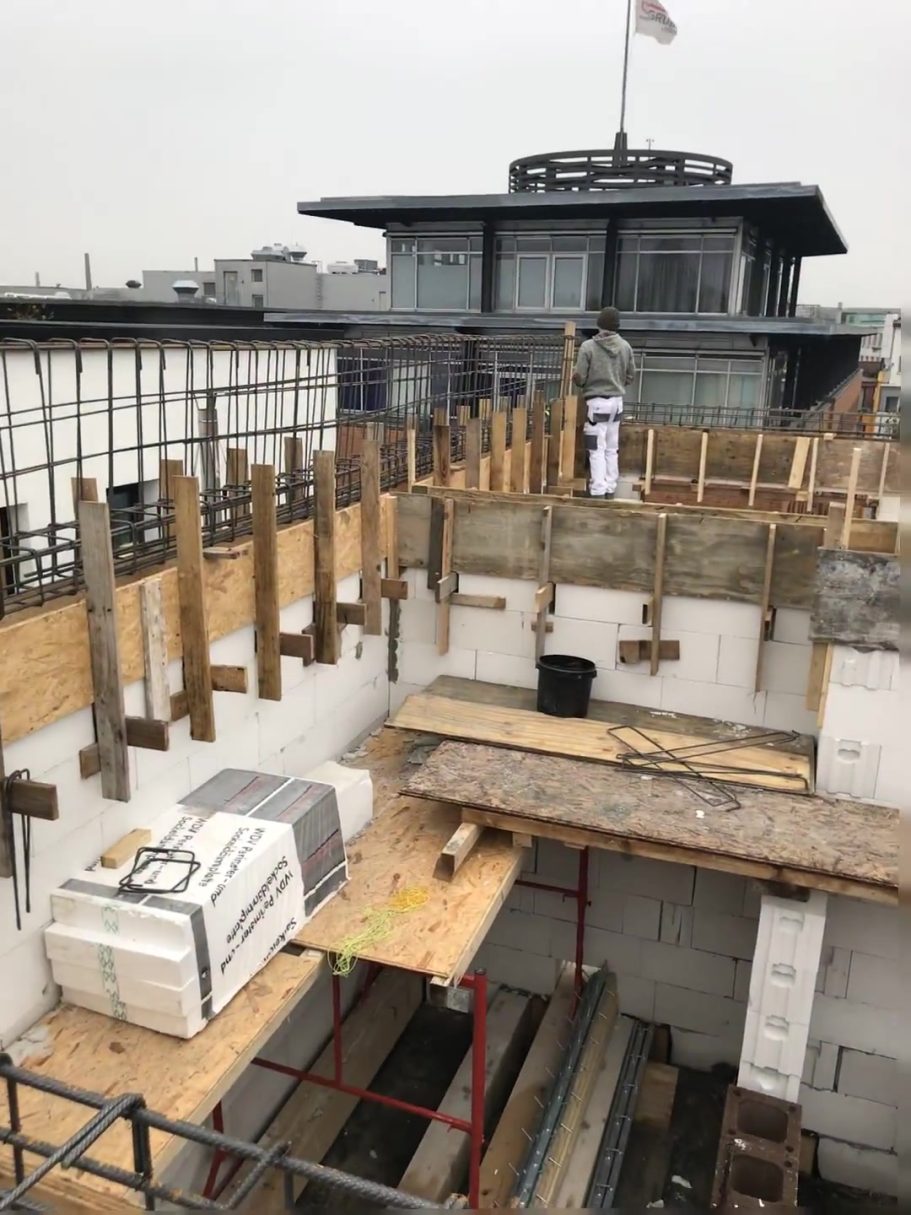 Danach Beginn der Errichtung eines Staffel-geschosses mit Dachterrassen auf das vorhandene 5. OG des Gebäudes.