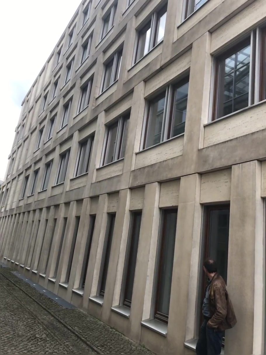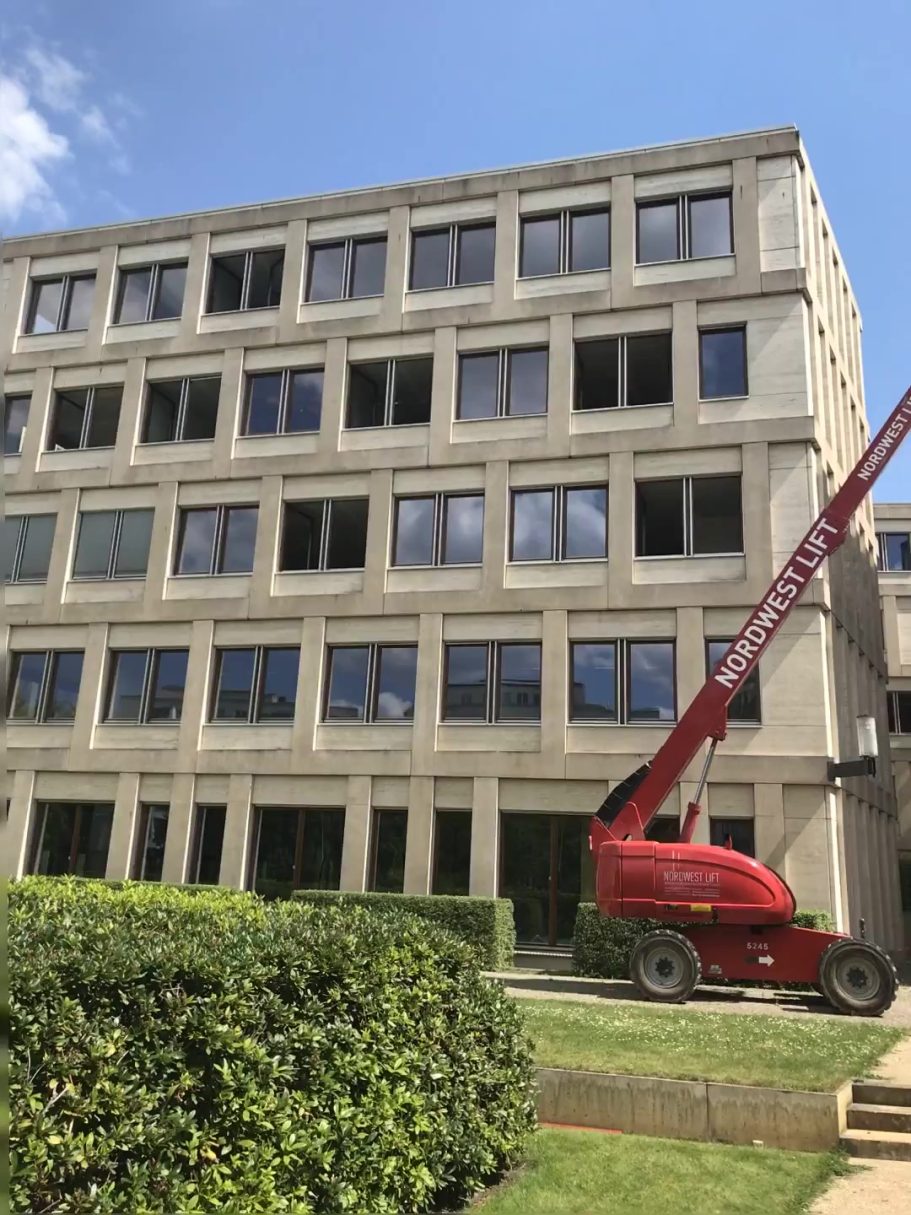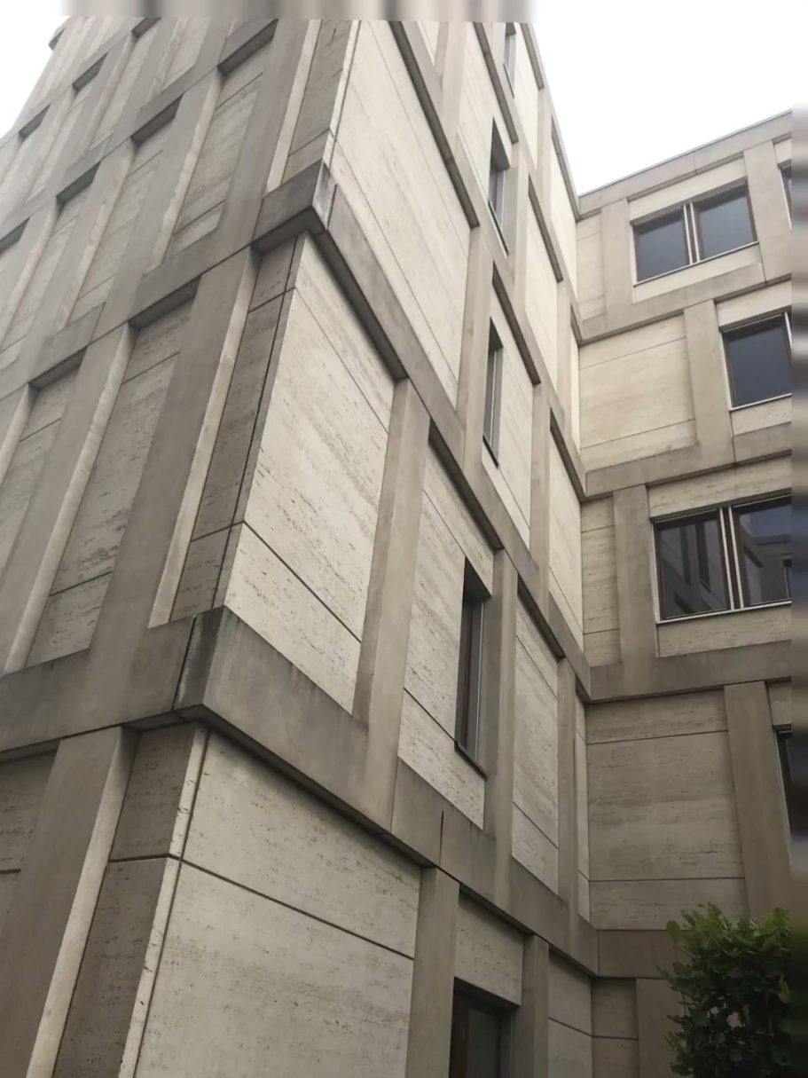 Bei diesem Gebäude wurde die gesamte Natursteinfassade aus Tavertin (2.500 qm) mit Heißwasser-Hochdruck-Geräten gereinigt. Das Abwasser wurde fachgerecht aufgefangen und entsorgt.